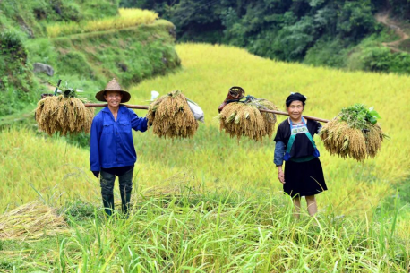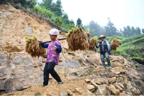 梁英迷(左)和老伴梁安合(右)挑谷子回家(2020年9月14日摄)
