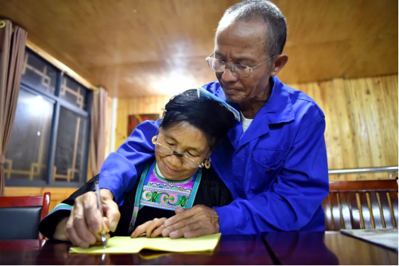 梁安合(右)在指导老伴梁英迷学习。(2020年9月14日摄)