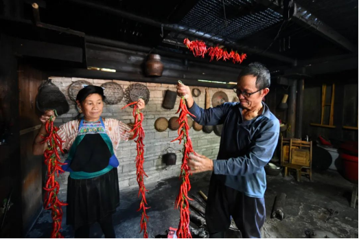 梁安合(左)和老伴梁英迷在挑谷子回家时合影(9月10日摄)。