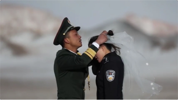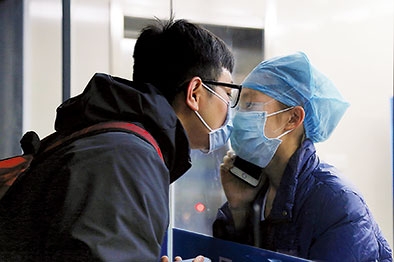 2020年2月4日,浙大四院感染科门口,陈颖和黄千瑞隔着玻璃门亲吻。金南星摄