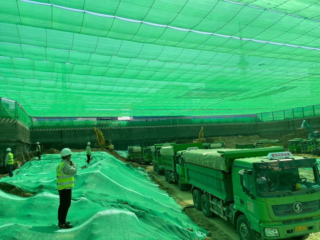 5月1日,在大兴宾馆环境整治项目施工现场,40余辆工程车紧密排列,100余名建设者密切配合,项目负责人在一线指挥调度。项目上安装了大跨度防尘天幕和喷淋系统,控制住扬尘和噪声的同时,有效降低基坑内温度,使人员作业环境得到有效改善。