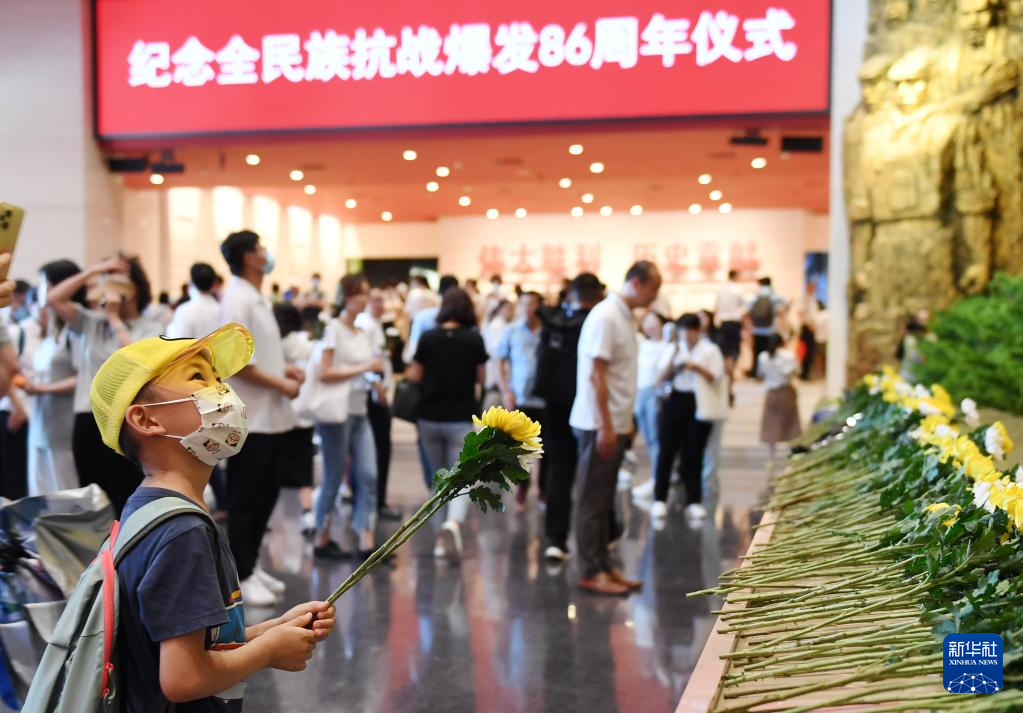 7月7日,一名小朋友在中国人民抗日战争纪念馆向抗战英烈献花。