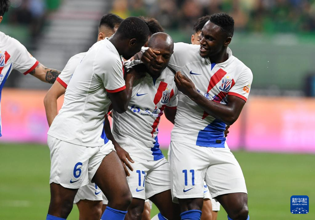 8月19日,上海申花队球员巴索戈(前)在比赛中庆祝进球。