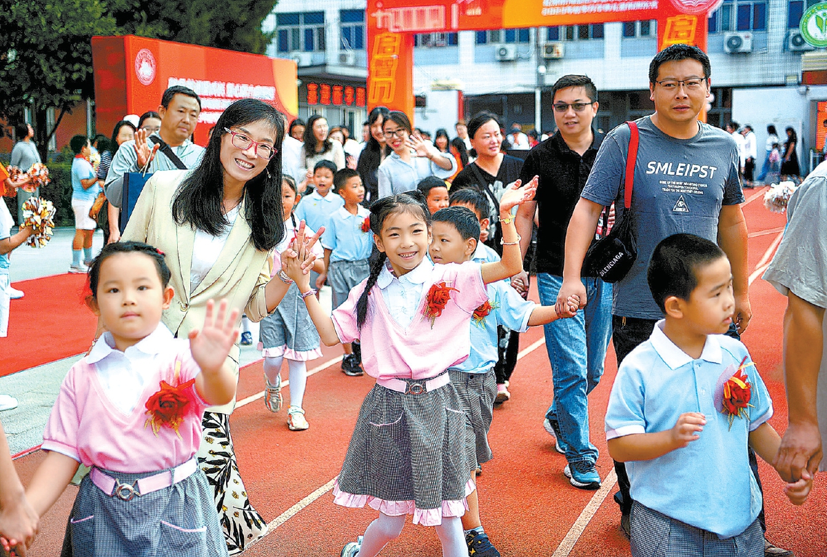 今天上午,海淀区实验小学九一分校举行秋季开学典礼暨揭牌仪式,孩子们高高兴兴迎接校园生活。记者 和冠欣 摄