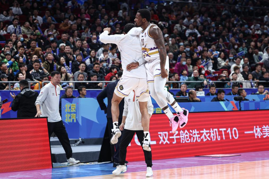 11月15日,北控队球员费尔德(右)与队友在比赛中庆祝。新华社记者 吴壮 摄
