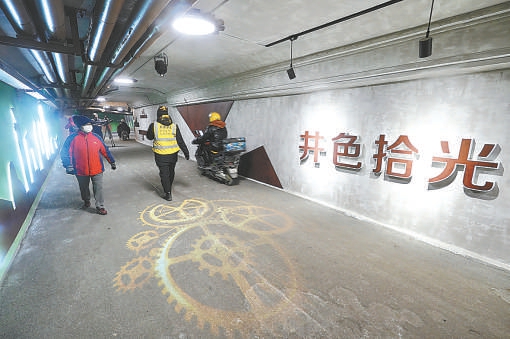 地下通道并不幽暗。记者看到,这里安装了主题灯、射灯,让廊道呈现出温暖柔和的色调。