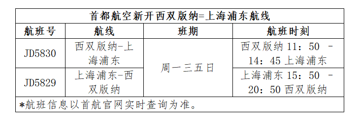 12月22日,海航航空旗下首都航空新开通西双版纳=上海浦东往返航线,班期为每周一、三、五、七。航班信息如下: