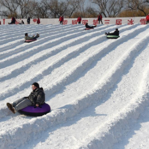 12月28日,工作人员在基本完工的圆明园雪场内体验滑雪圈。