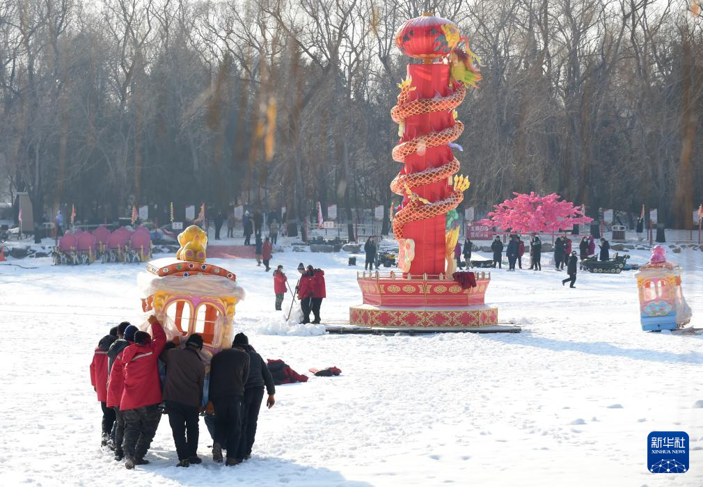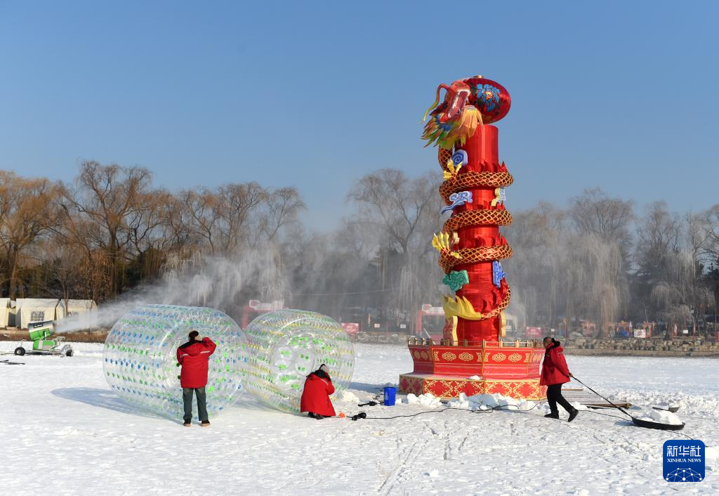 12月28日,工作人员在圆明园雪场内准备安装雪地龙舟船。