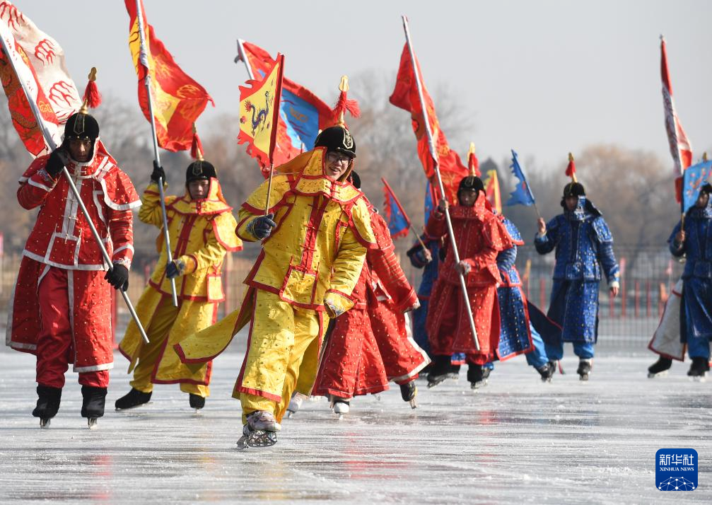 12月28日,冰嬉表演人员在圆明园冰场内训练。