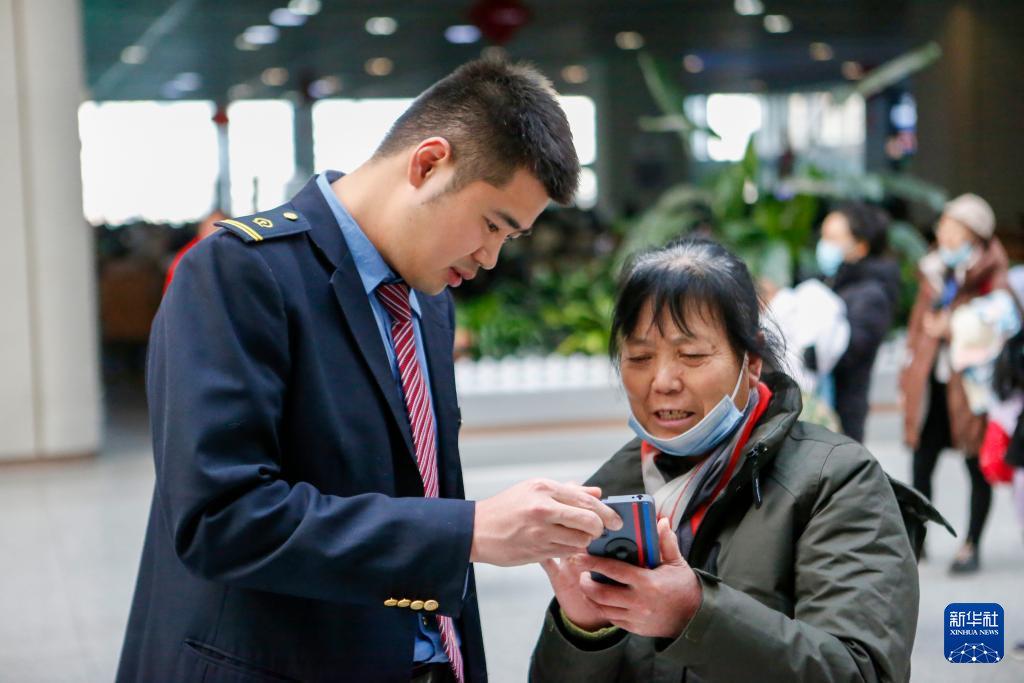 2月3日,在北京丰台站,旅客向工作人员咨询车次问题。