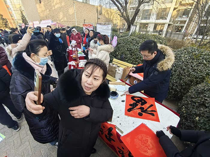 在摊位的另一侧是书法展台,那里排起了长长的队伍,陆续有居民喜笑颜开地拿着福字往外走,这是新春送福迎福活动,几位书法名家、平谷乡贤书法家、书法爱好者现场展示书法技艺,书写“福”字和春联免费赠送给居民,在增添节日氛围的同时,传播传承了中华优秀文化,丰富了居民精神文化生活,架起文艺为民惠民助民乐民的“同心桥”。活动现场还设置了“高大尚平谷”发展成果展,一张张生动鲜活的照片向市民讲述着平谷区农文旅体商、城乡建设、基层治理、民生服务保障等各项事业高质量发展的成果,让居民更加深入地了解到家乡建设的发展变化,进一步提升大家的幸福感和自豪感。