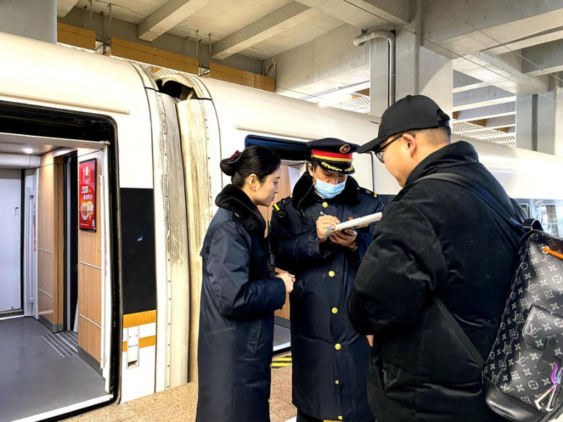 1月25日,陶志婷(左一)与列车员交接核对一名旅客的身份和座位信息。新华社发