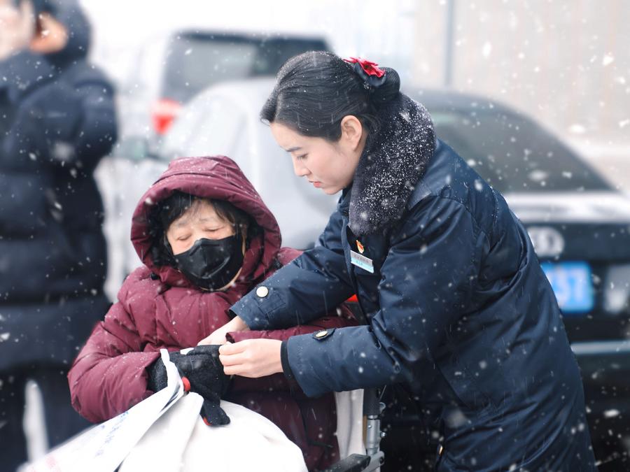 陶志婷(右一)冒雪护送一名旅客出站打车(2023年12月21日摄)。新华社发