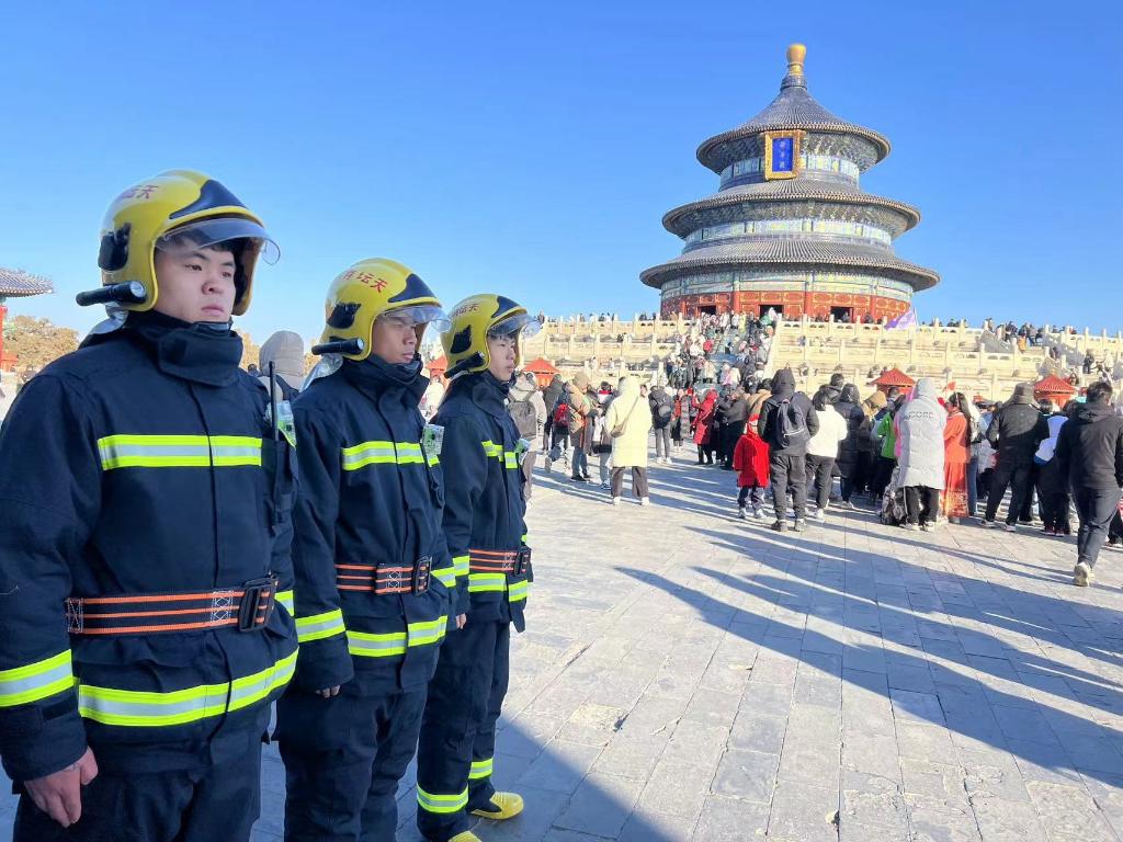 天坛公园微型消防站职工在祈年殿前值守。(天坛公园供图)