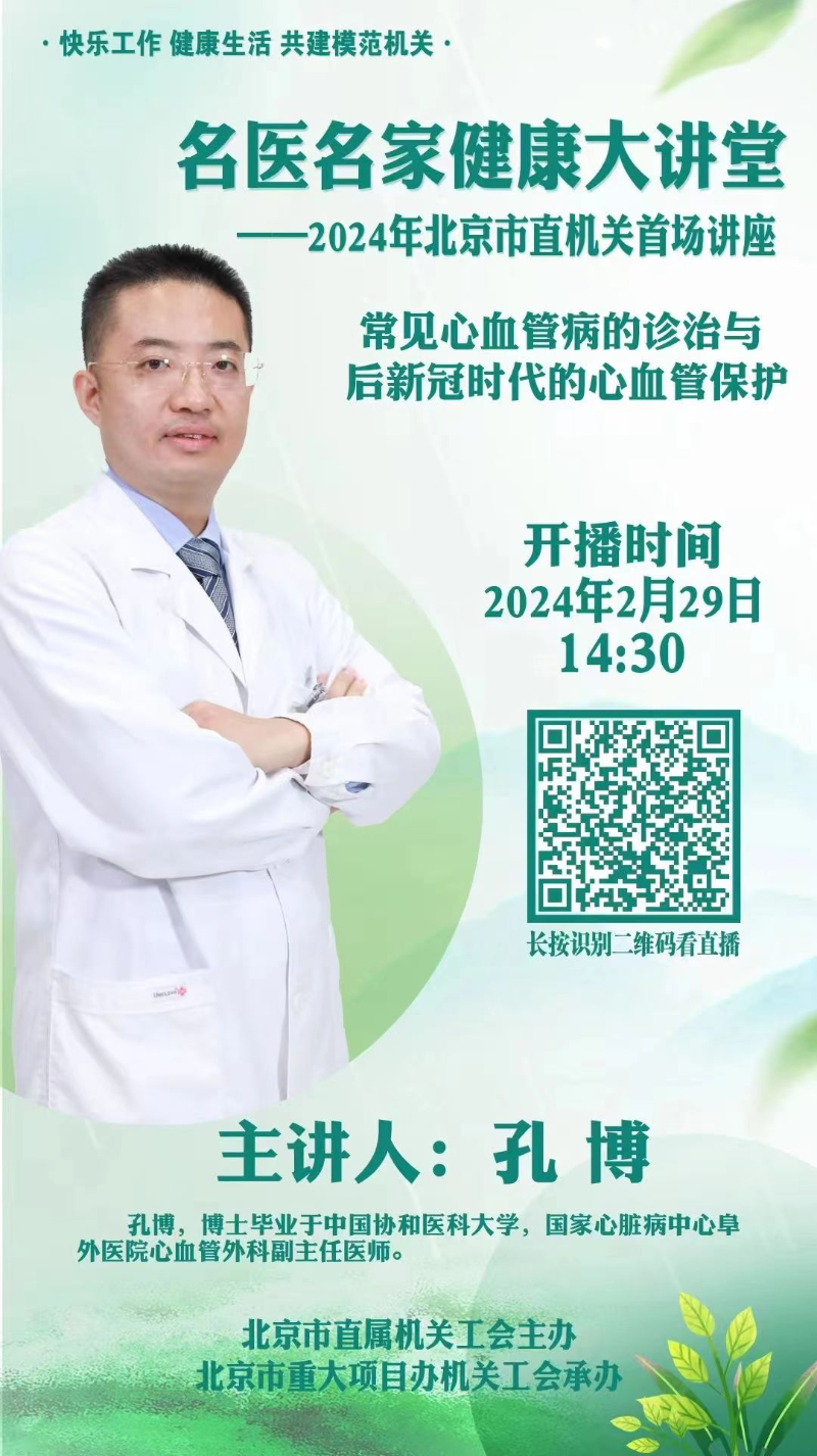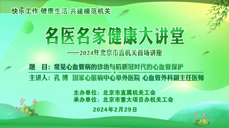 按照市直机关工会年度重点工作安排,2月29日下午,市直机关工会正式启动2024年“名医名家健康大讲堂”活动。邀请国家心脏病中心阜外医院心血管外科副主任医师孔博老师,以“常见心血管病的诊治与后新冠时代的心血管保护”为题,聚焦后疫情时代如何做好个人的心理调适、心血管保护和压力管理等,为市直机关干部职工带来了舒缓压力、保持心血管健康的解决方案。