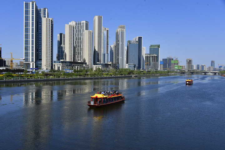 游船驶过位于北京市通州区的运河商务区(资料图)。新华社发(常鸣 摄)