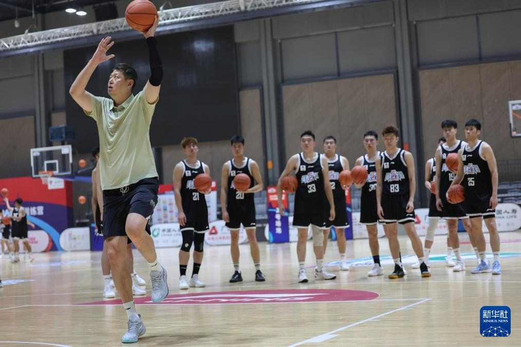 7月23日,教练员莫科(前)在开营仪式后为训练营球员示范投篮。