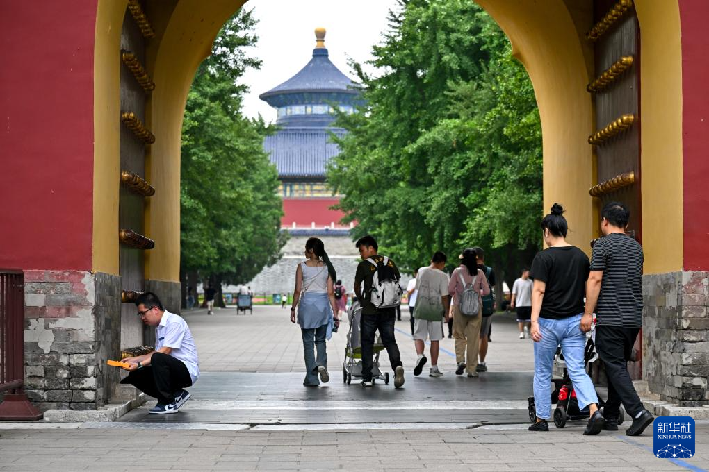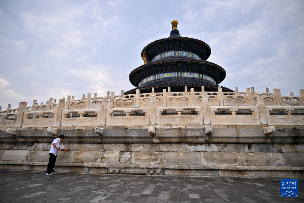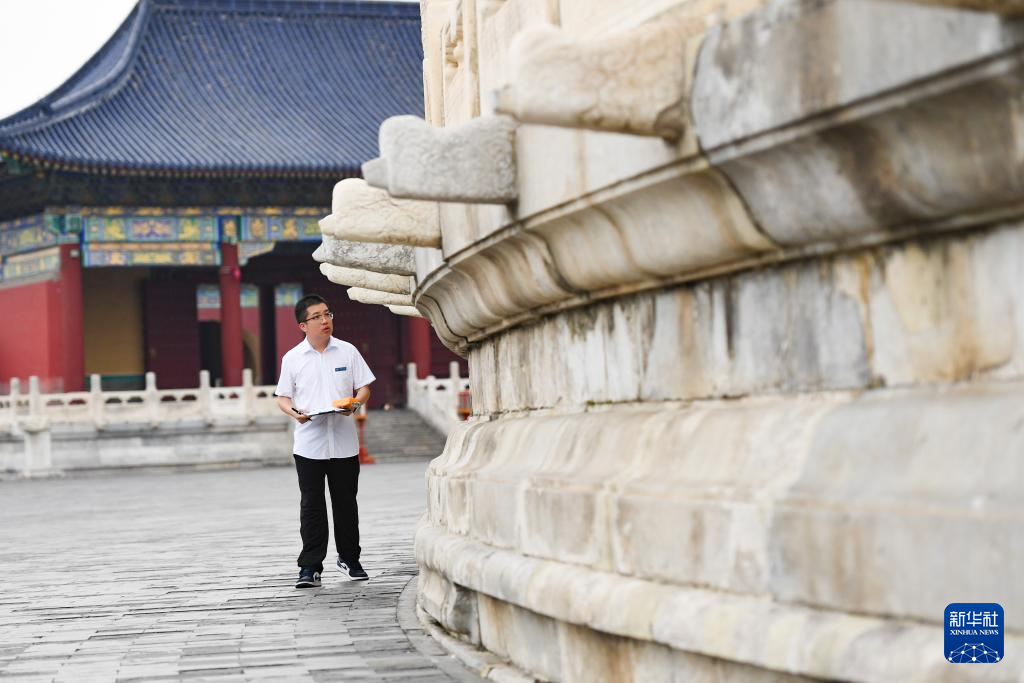 陈赓在天坛祈年殿古建群内进行巡检(7月19日摄)。北京市天坛公园管理处基建科古建项目管理工程师陈赓是一名年轻的“古建医生”。在天坛公园,他负责古建的日常巡查、保养和维护,保证古建“延年益寿”。对从小喜欢传统建筑的他来说,这样的工作充满趣味。2023年,陈赓参与了天坛相关文物修缮工程。从项目前期踏勘,到制定不同古建的预防性保护措施,再到施工管理,陈赓全程参与,用专业和热爱,助力北京中轴线申遗。