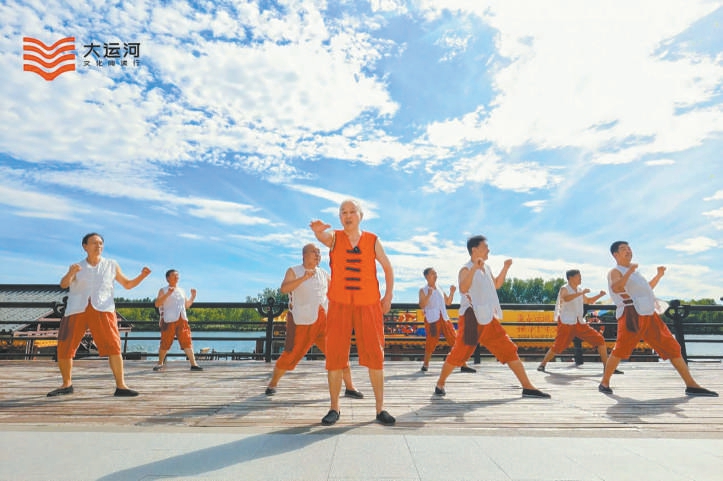 “开船喽……”在大运河森林公园漕运码头上,通州运河号子第四代传承人赵义强带领团队展示了铿锵有力的表演,引来大运河森林公园的游客驻足。