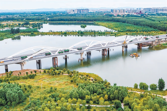 宽阔的潮白河上,一座连接京冀两地的白色大桥,展现出雄伟身姿。