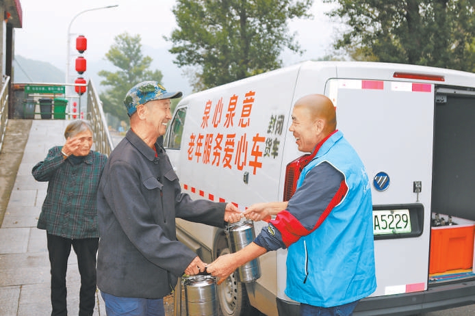 寒露将近,大山里寒意渐生。10月2日上午九点,延庆区珍珠泉乡老年助餐服务中心,热腾腾的饭菜出锅,打包、装车。九点半,送餐员王永龙像往常一样发动车辆,准点出发。车体上,“泉心泉意老年服务爱心车”11个红色字体十分醒目。