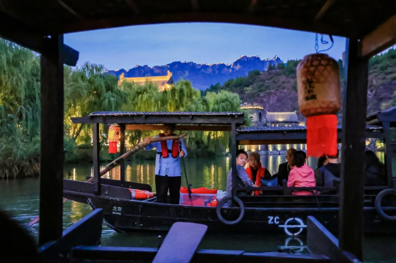9月23日晚,在北京市密云区古北水镇,游客乘坐摇橹船欣赏沿岸非遗表演。(北京市密云区供图)