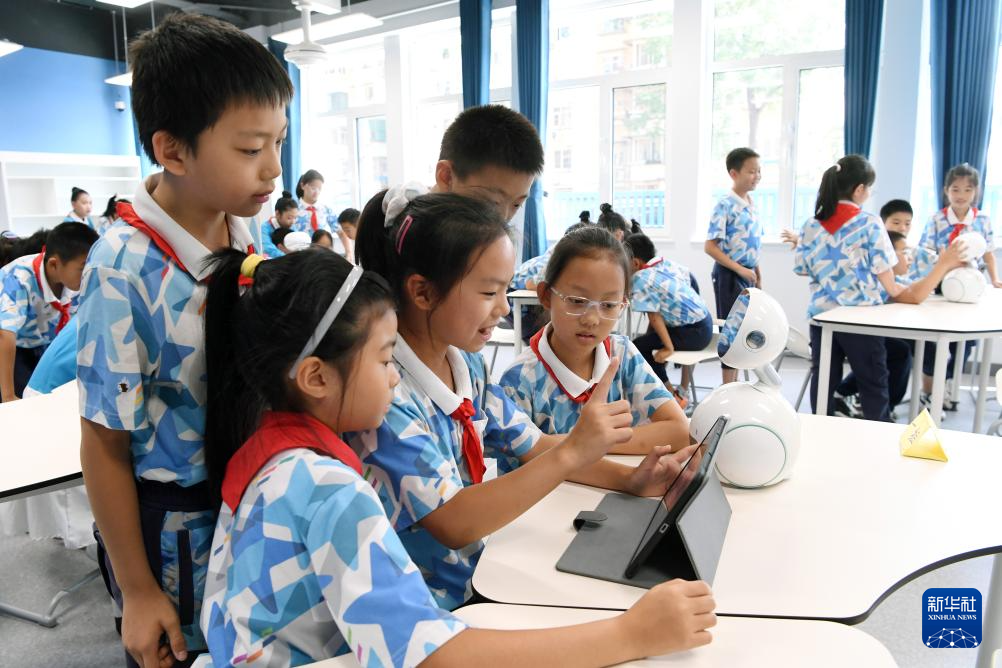9月24日,北京市第二十中学附属育鹰小学学生在人工智能教育通识课《从国防到生活——AI人脸识别》了解人脸识别技术。