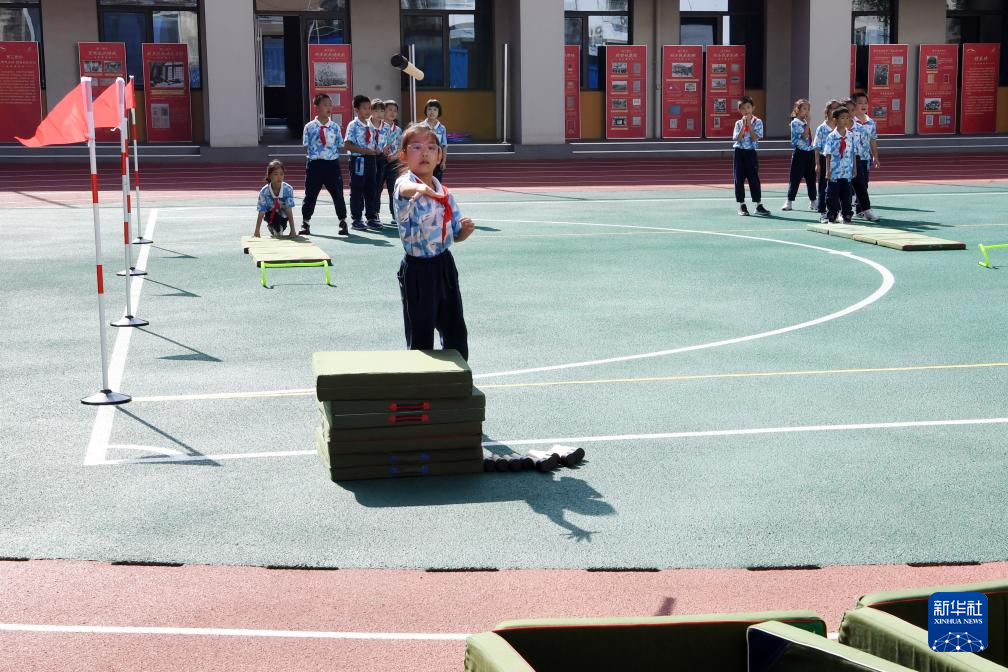 9月24日,北京市第二十中学附属育鹰小学学生在国防教育基础课《侦察兵大比武——投掷与游戏》上投掷。