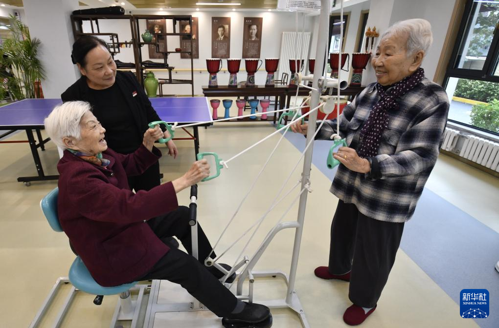 10月17日,老人们在北京市朝阳区来广营区域养老服务中心福寿苑养老公寓内锻炼身体。