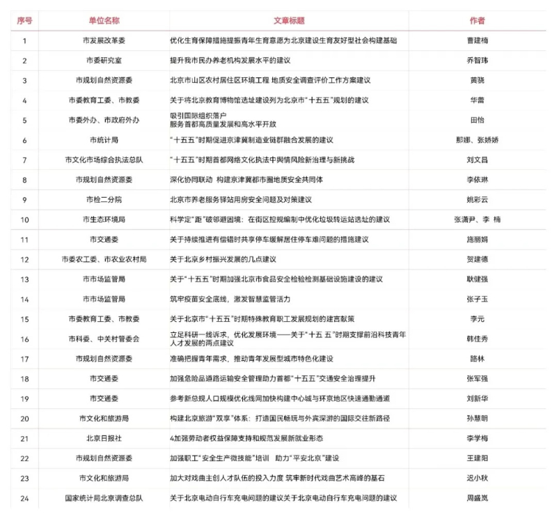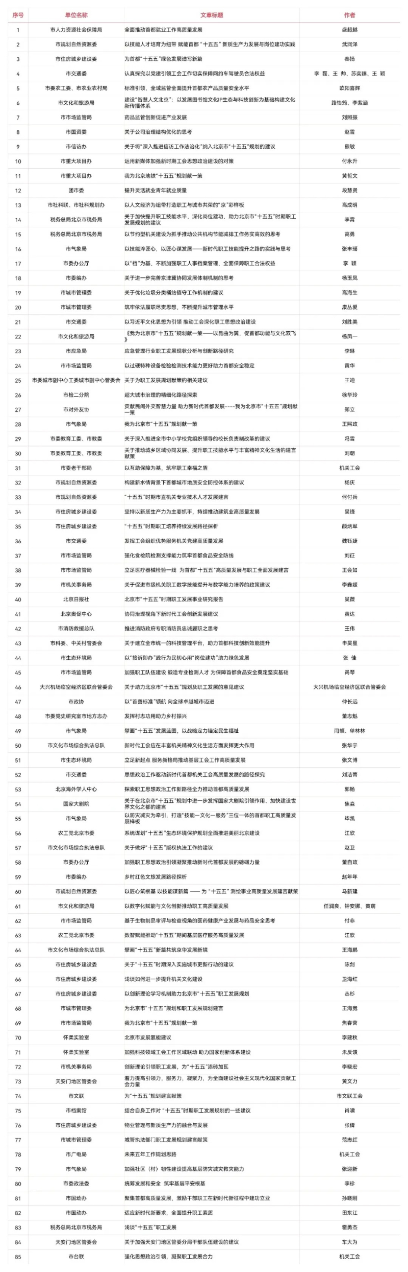 征集活动自2025年7月启动以来,市直机关各级工会高度重视、精心组织,市直机关劳模先进、工匠人才和广大工会会员积极响应、踊跃参与,活动共收到来自74家单位推荐的243篇优秀建言文稿,这些建言紧扣主题,既有理论深度,又有实践意义,涵盖了首都经济社会发展的关键领域和职工权益保障的热点问题,具有较强的理论性、创新性和可操作性。经专家评审组严格评审,最终评选出一等奖24篇、二等奖54篇、三等奖80篇,优秀奖85篇。