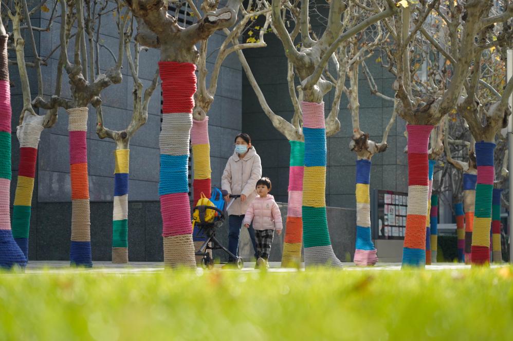11月29日,北京市民在“披”上彩色针织 “外衣”的行道树间行走。新华社记者 谢晗 摄