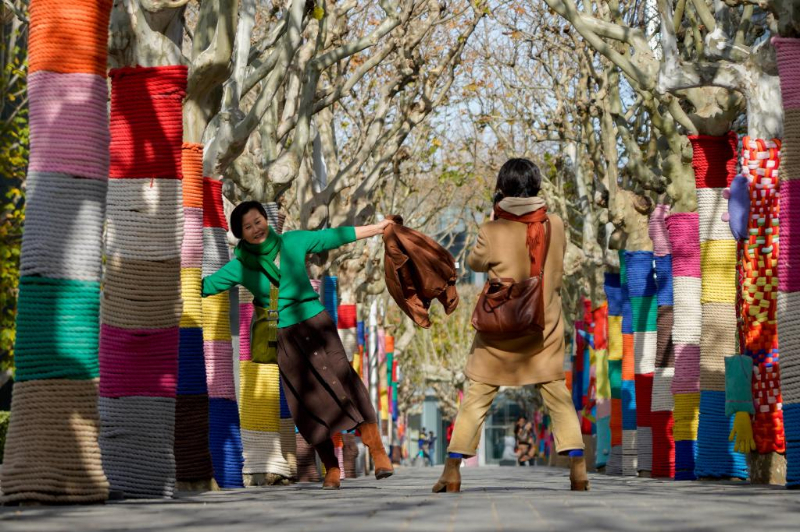 市民在披着彩色“针织外衣”的行道树间拍照。新华社记者 谢晗 摄