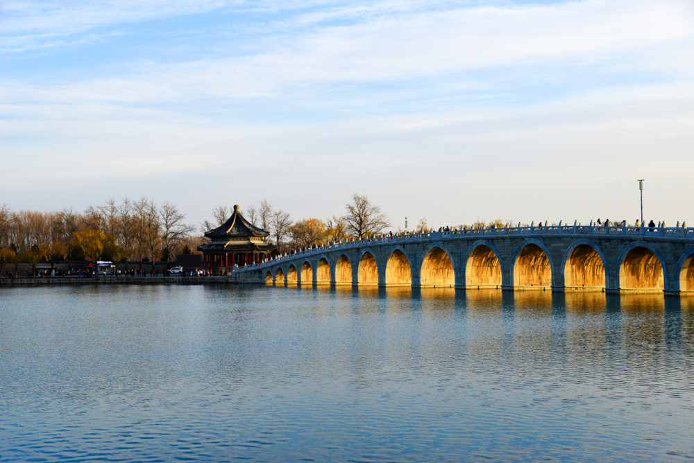 2025年12月1日,北京颐和园十七孔桥上演“金光穿洞”自然景观,吸引游客和摄影爱好者观赏拍照。