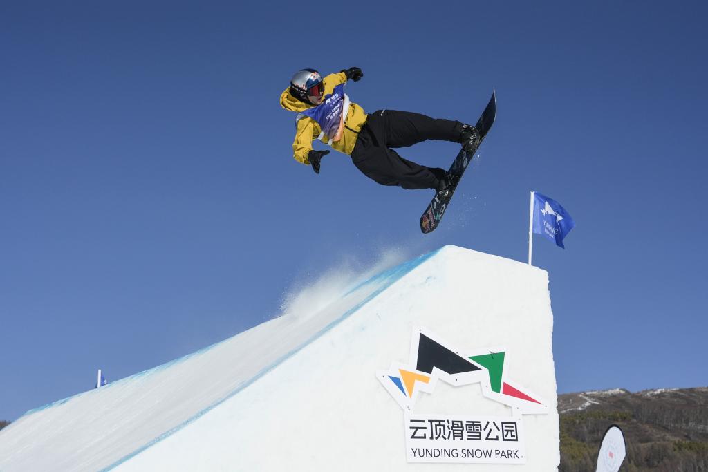 11月29日,国际雪联大跳台世界杯云顶站单板滑雪男子组决赛在河北省张家口市崇礼区云顶滑雪场进行。图为苏翊鸣在决赛中。新华社记者 卢星吉 摄