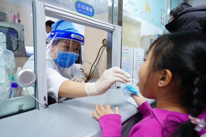 图为在北京儿童医院,医务人员正在为患儿进行病原学检测。新华社发
