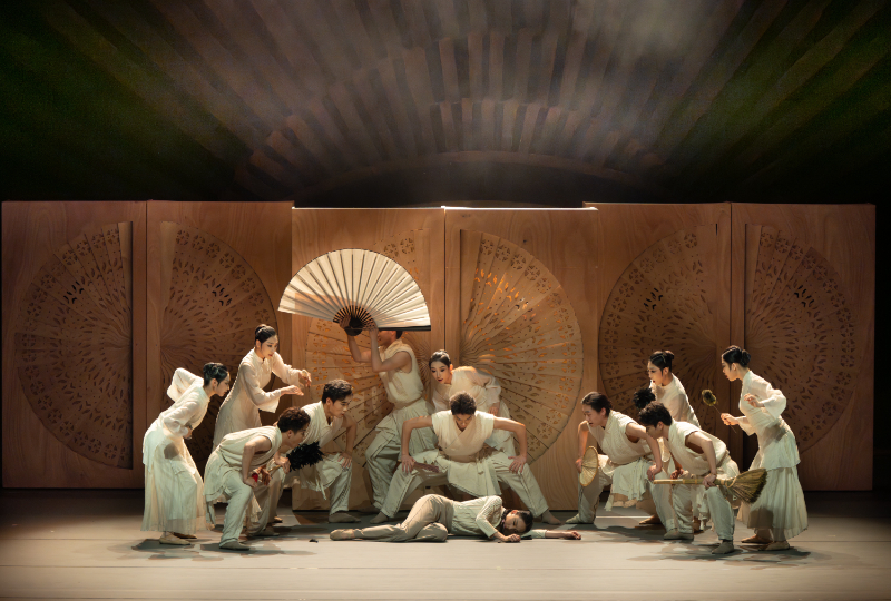 在歌剧院,浙江音乐学院原创舞剧《一扇百年》以国家级非物质文化遗产“杭扇制作技艺”为题材,通过穿越时空的叙事,讲述两代制扇人跨越百年的技艺传承与情感羁绊。作品以“扇”为意象,将工艺、文化与人物命运巧妙融合,蝴蝶、山水、荷影等江南意象借扇而生,近二十种扇具系统展示杭扇技艺之精妙,诗意盎然的舞台演绎出中华文明绵延不绝的生命力。