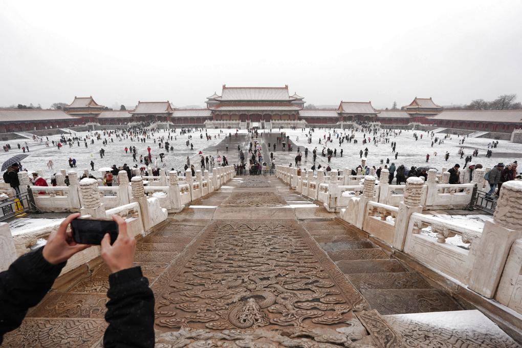 12月12日,游客在北京故宫赏雪拍照。