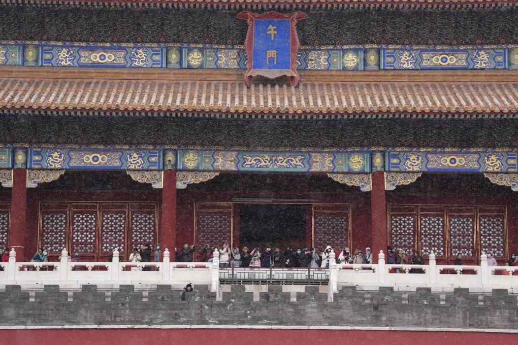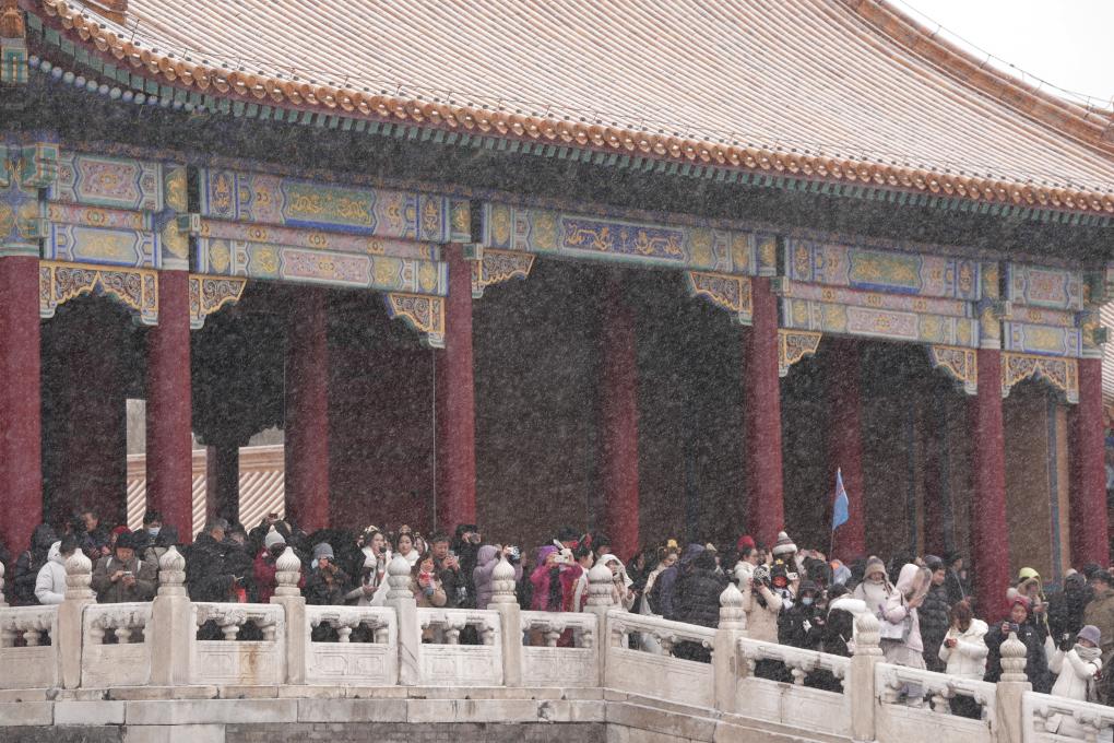 12月12日,游客冒雪参观北京故宫。