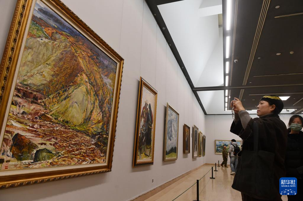 12月21日,参观者在中国美术馆拍摄展出作品《春满牡丹园》。