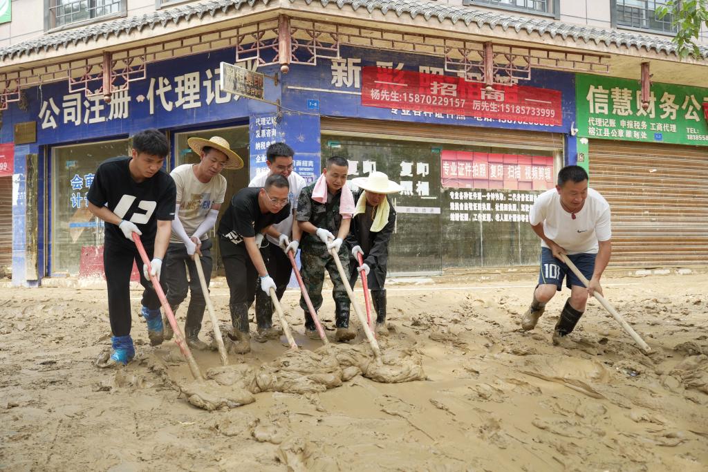 林进标(左一)在贵州省榕江县新城区清淤(2025年6月26日摄)。新华社发(王炳真摄)