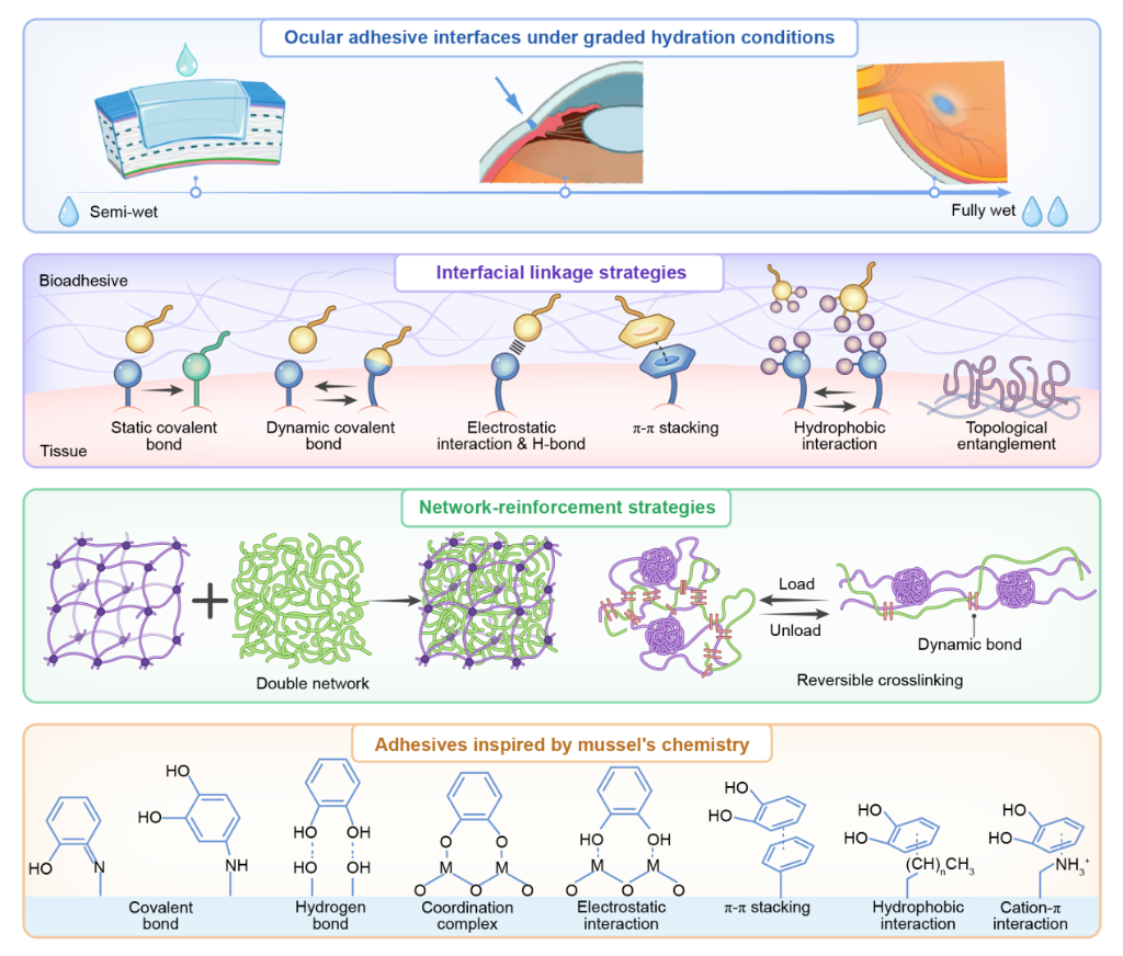 研究团队介绍,眼科粘合材料分为眼表粘合和眼底粘合两大类,针对性解决不同眼部区域的治疗需求。对于角膜等眼表疾病,“生物胶水”已展现出亮眼潜力,能实现无缝线角膜移植,填充修复大范围角膜缺损,即便在湿润、渗血的复杂创面上也能即时封闭,可大幅拓展眼表修复的适用场景,提升治疗效果。