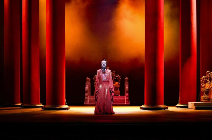 舞台上,灵感来自故宫大殿的八根红色立柱和多媒体影像构建起跨越时间的表演空间,在实与虚、明与暗之间连接现实与想象。不同人物在不同空间交会,从不同侧面展现了角色的内心世界。