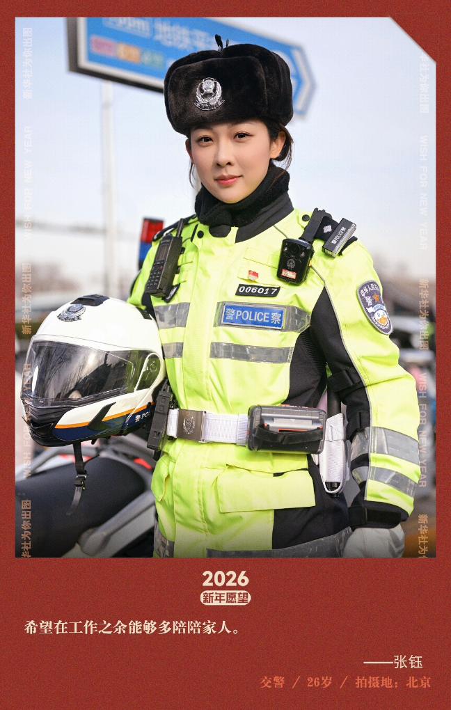 26岁的张钰是北京西城交通支队女子铁骑队的一员,负责鼓楼路口及景山、什刹海等景点周边道路的交通疏导、巡逻和应急处置工作。她的新年愿望是:2026年在工作之余能够多陪陪家人,同时能和同事们一起擦亮北京交警“金名片”。