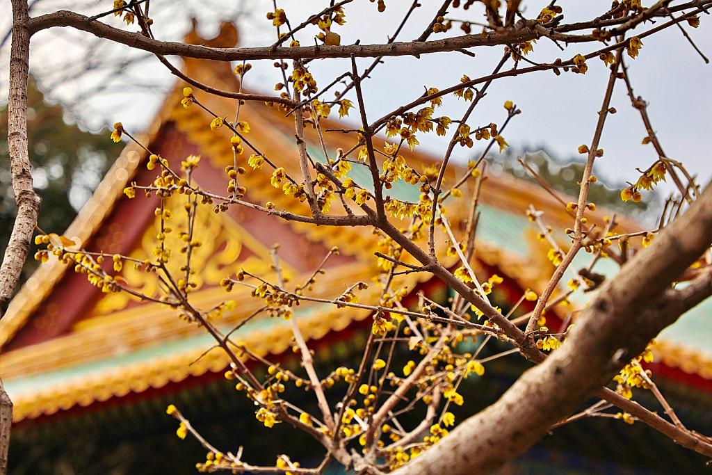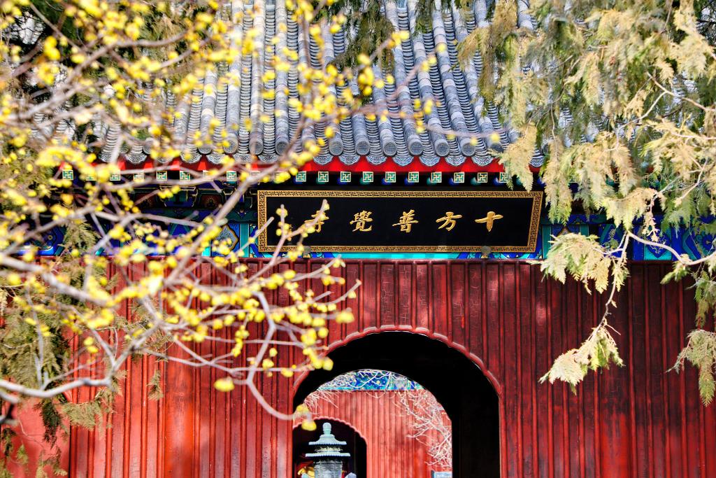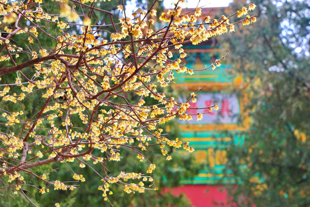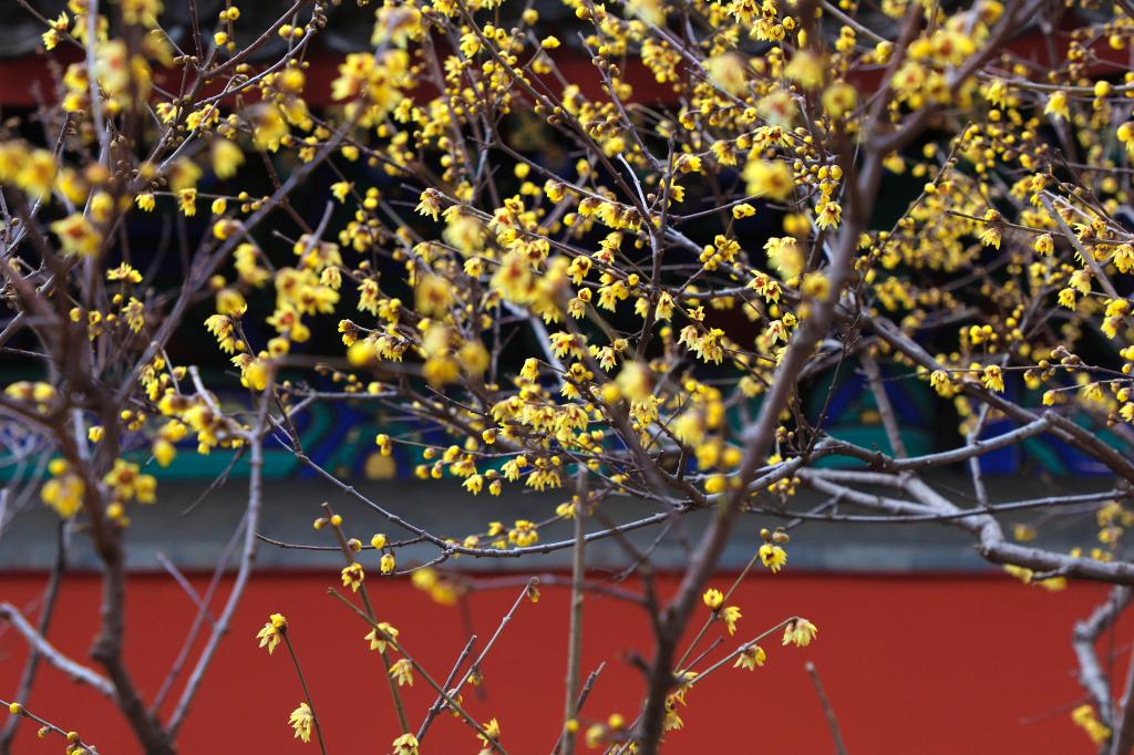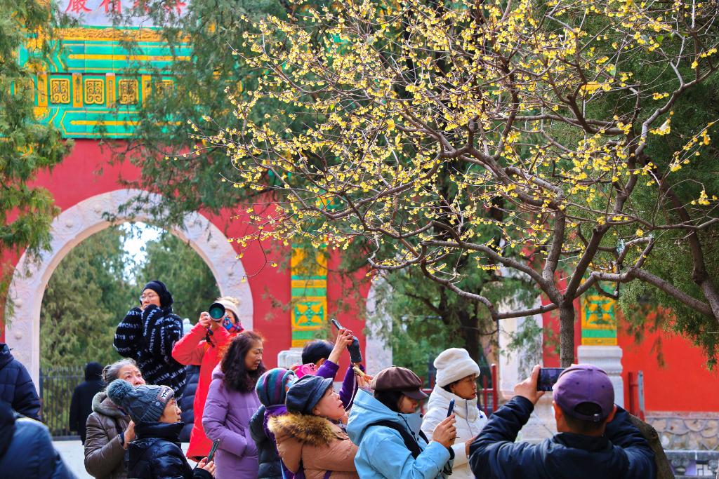 近日,北京卧佛寺内蜡梅迎寒绽放,金黄色的花瓣在红墙黛瓦的映衬下愈发莹润,吸引不少市民游客前来打卡拍照。