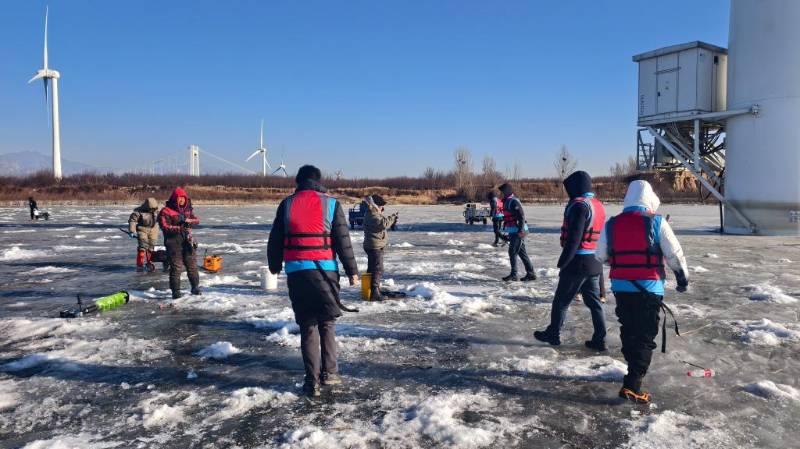 图为北京市水务部门开展巡查活动,劝阻野钓人员离开冰面。新华社发