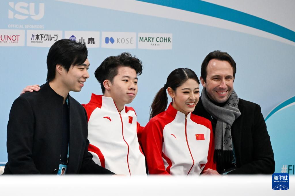 1月22日,中国组合肖紫兮(右二)/何凌昊(左二)在冰舞韵律舞比赛后等待分数。