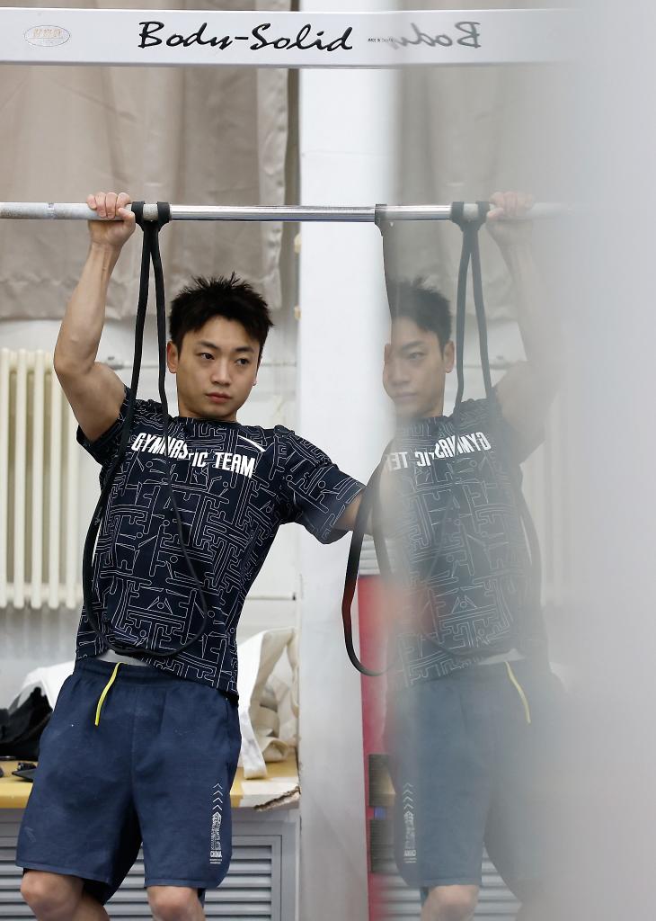 1月31日,邹敬园在训练前拉伸。新华社记者 王丽莉 摄