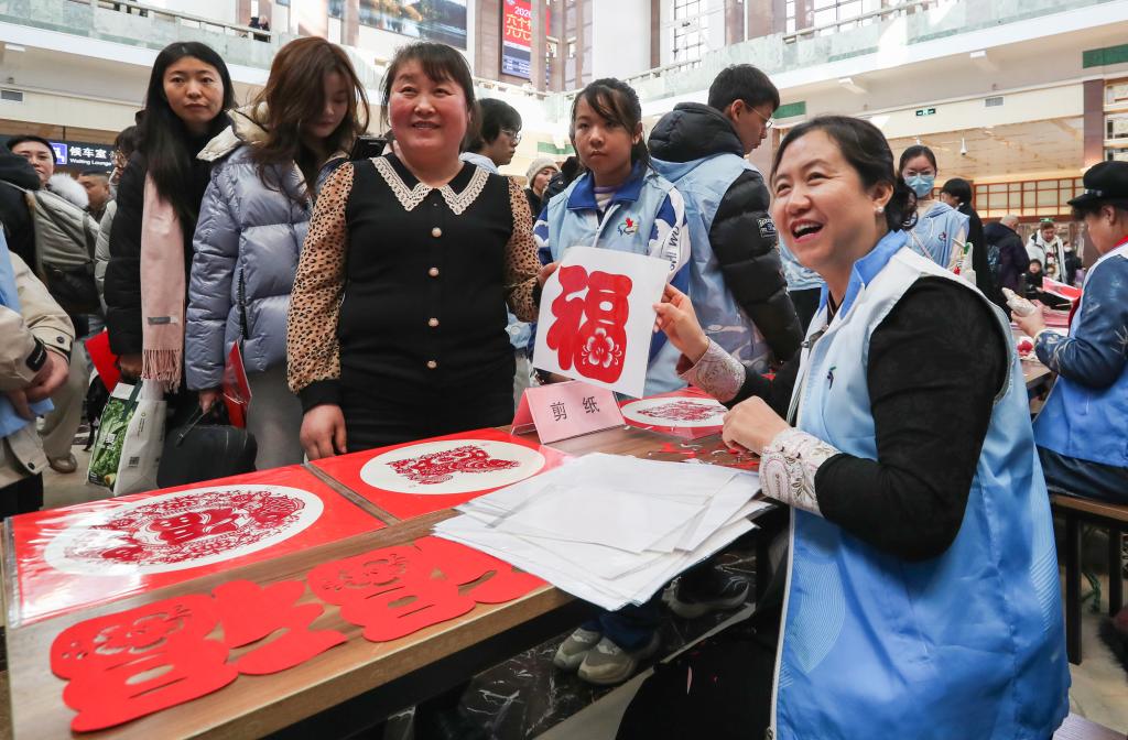 2月10日,文化志愿者在完成剪纸作品后与旅客合影。