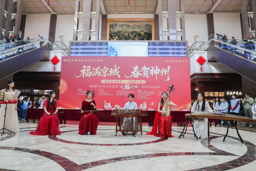 2月10日,“福满京城 春贺神州”2026年北京文化志愿者“送福到家”系列文化活动启动仪式在北京站启幕。活动通过民乐表演、送春联等方式,为南来北往的旅客打造了一场热闹的文化盛宴。